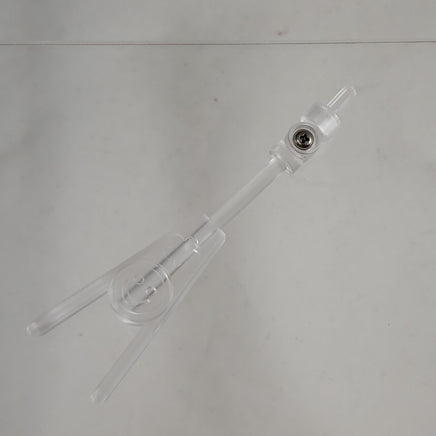 This is a type of 2 piece, adjustable Nendoroid stand that has not been included with any released Nendoroid. It is being exclusively sold seperately as a different option for Nendoroid support. It functions without a base or pedestal piece and instead has a special arm that acts to prop the Nendoroid up by using a traditional peg piece in the back. This will only work for standard Nendoroids that have a hole in their back (mainly those numbered 300 or later) and depending on the style of hair might not be ideal for all Nendoroids. The arm is adjustable to help fit it under long hair pieces and to adjust for the different heights of the holes in the back of Nendoroids. This stand is designed for Doll use as it is too tall to work for standard Nendoroids typically.